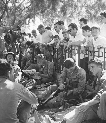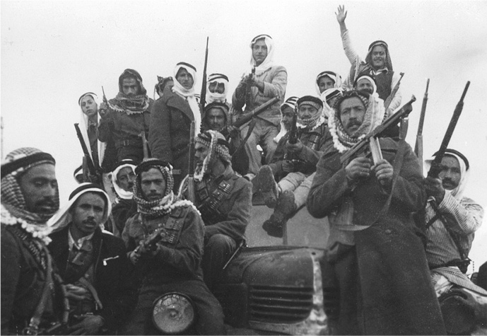 6. Эта постановочная пропагандистская фотография показывает смешанную группу солдат регулярной армии и ополченцев, защищающих Иерусалим от атаки еврейских «банд» под командованием мусульманского священнослужителя (это можно определить по его тюрбану).