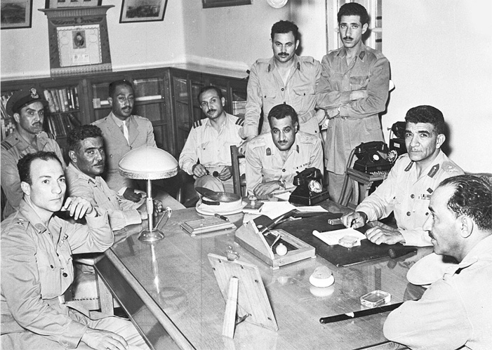 8. Члены движения «Свободные офицеры» вскоре после прихода к власти в Египте в июле 1952 года. 51-летний генерал Мухаммад Нагиб (сидит за столом справа) был самым старшим среди участников переворота, средний возраст которых составлял 34 года. В 1954 году подполковник Гамаль Абдель Насер (сидит справа от Нагиба) посадил Нагиба под домашний арест и занял президентское кресло. Правая рука Насера, майор Абд аль-Хаким Амер, стоит справа от Нагиба. Будущий третий президент Египетской республики, лейтенант-полковник Анвар Садат, сидит четвертым слева.
