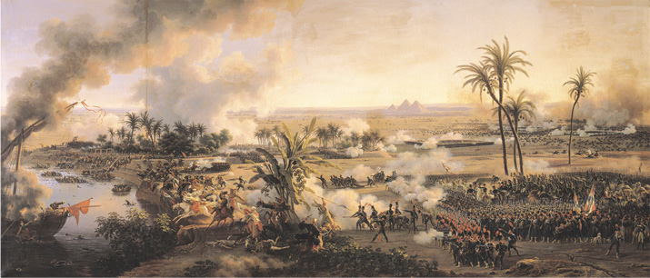 4. Прежде чем с триумфом вступить в Каир, французские войска под командованием Наполеона Бонапарта нанесли решающее поражение правившим в Египте мамлюкам в битве у пирамид, состоявшейся 21 июля 1798 года. Эта картина Луи-Франсуа Лежена (1775–1848) была написана в 1806 году по эскизам, сделанным во время сражения. Лежен запечатлел неравный бой между мамлюкской кавалерией и дисциплинированной, не нарушающей ряды французской пехотой, «непрерывная стрельба» которой, по словам египетского историка аль-Джабарти, «оглушала».