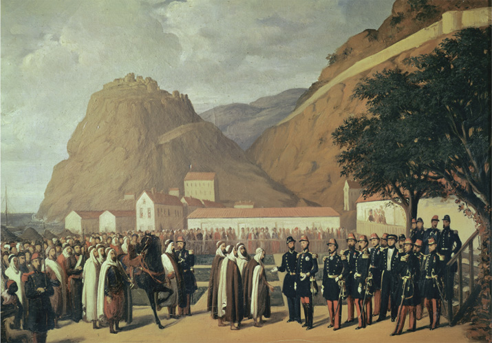 8. Эмир Абд аль-Кадир возглавлял алжирское сопротивление французам с 1832 года до окончательного поражения повстанцев в 1847 году. Французский художник Огюстен Режис (1813–1880) запечатлел момент сдачи Абд аль-Кадира герцогу Омальскому. Своим решительным сопротивлением алжирец снискал во Франции всеобщее восхищение и был с почестями принят президентом Французской республики Луи Наполеоном, а затем получил от французов пожизненную пенсию и был отправлен в ссылку в османские владения. Абд аль-Кадир поселился в Дамаске, где сыграл значимую роль в спасении многих христиан во время резни 1860 года.