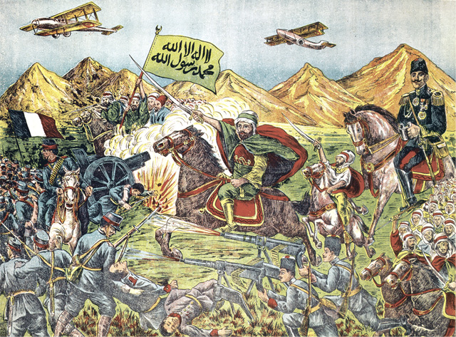 12. Подобные изображения Абд аль-Карима аль-Хаттаби (Абд аль-Крима), сра- жающегося с французами в Марокко, будоражили воображение националистов по всему арабскому миру в 1925 году. Абд аль-Крим привел свое берберское войско, базировавшееся на севере страны в труднодоступных Рифских горах, к победе сначала над испанцами, а затем и над французами, прежде чем европейцы объединили силы и в 1926 году разгромили повстанцев. На этой литографии французы с их самолетами и артиллерией вынуждены отступать под натиском конных марокканцев, ведомых Абд аль-Кримом под исламским знаменем с надписью «Нет бога, кроме Аллаха, и Мухаммад — Пророк Его».