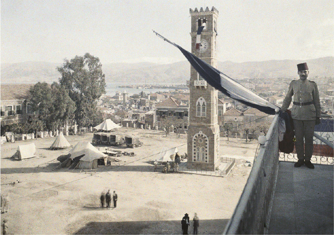 14. Бейрут под французским правлением, 22 ноября 1919 года. Французский триколор украшает османскую часовую башню и балкон главного административного здания, а внизу, на площади, стоят лагерем войска. Хотя на Парижской мирной конференции в 1919 году некоторые ливанцы активно добивались французского мандата, они рассчитывали, что Франция будет более бескорыстна и окажет их стране помощь в создании институтов независимой государственности.