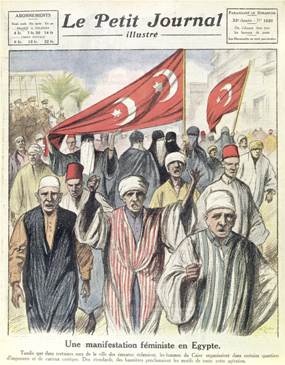 17. Женщины впервые начали участвовать в политической жизни Египта в 1919 году — и сразу попали в заголовки газет по всему миру. Этот французский еженедельник сообщает о «феминистской демонстрации в Египте», изображая группу женщин с закрытыми лицами, окруженных толпой мужчин, под носом у британской конной полиции. Одним из лидеров женского движения стала Худа Шаарави, муж которой, Али, был выслан из страны вместе с Заглулом и другими членами «Вафд».