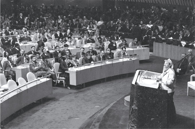 5. Когда председателя Организации освобождения Палестины Ясира Арафата пригласили 13 ноября 1974 года выступить перед Генеральной Ассамблеей ООН, ему был оказан прием как главе государства. Израильская делегация в знак протеста покинула свои места в первом ряду. «Сегодня я пришел сюда с оливковой ветвью в одной руке и с оружием борца за свободу в другой, — заявил Ясир Арафат, обращаясь к переполненному залу. — Не дайте оливковой ветви выпасть из моей руки».