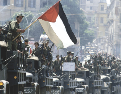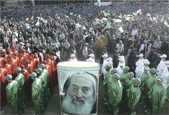 18. Неспособность соглашений, достигнутых в Осло, обеспечить урегулирова- ние израильско-палестинского конфликта на основе сосуществования двух государств привела к росту поддержки Исламского движения сопротивления ХАМАС. В марте 2005 года сторонники ХАМАС организовали массовый митинг в городе Наблус на Западном берегу реки Иордан в ознаменование первой годовщины убийства израильтянами основателя и духовного лидера движения шейха Ахмада Ясина (на фото вверху). В 2006 году ХАМАС обогнало ФАТХ на выборах в Палестинский законодательный совет и получило подавляющее большинство парламентских мест.