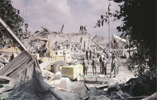 12. Зверские массовые убийства в Сабре и Шатиле вынудили американские, французские и итальянские войска вернуться в Ливан. Они вошли в страну в качестве миротворцев, но в попытке поддержать ливанское правительство президента Амина Жмайеля оказались втянуты в боевые действия. 23 октября 1983 года скоординированные взрывы террористов-смертников сровняли с землей французские и американские казармы. В одно мгновение погибли 241 американский военнослужащий и 58 французских десантников. На фото: морские пехотинцы США помогают спасательной операции на руинах их штаб-квартиры вблизи Бейрутского международного аэропорта.