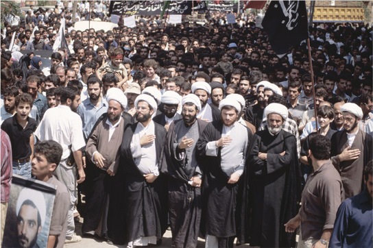 13. В 1980-е годы о себе как о новой силе заявили ливанские шииты. Они были связаны с атаками на штаб-квартиры французских и американских миротворческих контингентов в 1983 году и с рядом нападений на израильские силы в Ливане. В 1985 году появилась новая, поддерживаемая Ираном, организация под названием «Хизбалла». Боевики «Хизбаллы» вынудили израильтян в 2000 году вывести войска из Южного Ливана. На фото: группа священнослужителей, возглавляемая членами «Хизбаллы», в день Ашуры, поминовения имама Хусейна Ибн Али, в Западном Бейруте в 1989 году.