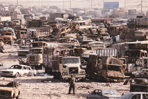 15. После начала наземной операции иракские войска начали стремительное отступление, отбирая у населения грузовики и автомобили, чтобы выбраться из Кувейта. Тысячи транспортных средств были уничтожены с воздуха американскими ВВС на открытом участке трассы 80, ведущей из Кувейта в Ирак. Эта бойня на «шоссе смерти», как ее стали называть, вызвала осуждение со стороны международного сообщества и подтолкнула президента США Джорджа Буша — старшего к тому, чтобы завершить операцию «Буря в пустыне» 28 февраля 1991 года.