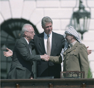 16. Одним из последствий освобождения Кувейта стало начало первого значимого мирного процесса между Израилем и палестинцами. Тайные двусторонние переговоры, проходившие под эгидой министерства иностранных дел Норвегии, привели к заключению соглашений в Осло, подписанных Израилем и ООП и скрепленных историческим рукопожатием между старыми врагами Ясиром Арафатом и Ицхаком Рабином в присутствии президента США Билла Клинтона в Белом доме 13 сентября 1993 года.