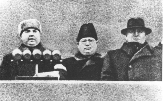 Г.М. Маленков, Н.С. Хрущев, Л.П. Берия на трибуне Мавзолея Ленина.