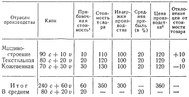 Во-первых, если товары, произведенные в машиностроительной промышленности, продаются выше стоимости (в нашем примере на 10 единиц), а кожевенные товары — ниже стоимости (на 10 единиц), то в масштабе всего общества сумма цен производства (360 единиц) полностью совпадает с суммой стоимостей (тоже 360 единиц).