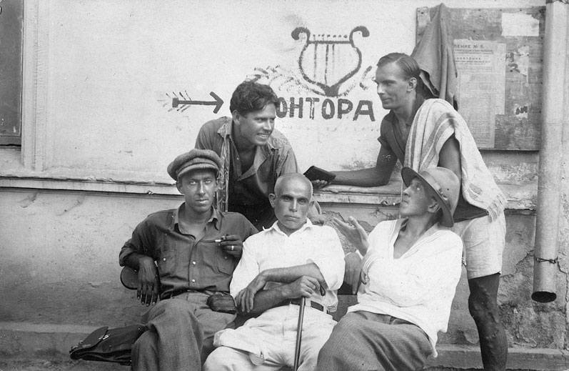 Слева направо сидят: Г. Петников, неизвестный, Дм. Петровский. Стоят: неизвестный, Вл. Луговской. Крым, 1926 г.