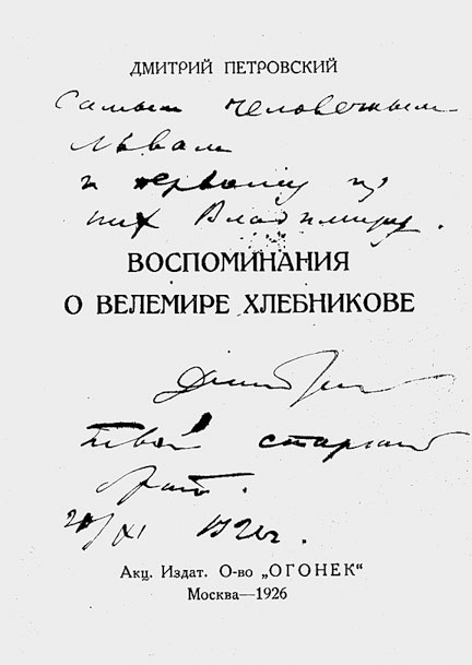 Дарственная надпись Д. Петровского В. Луговскому на книге ”Воспоминания о Хлебникове”.