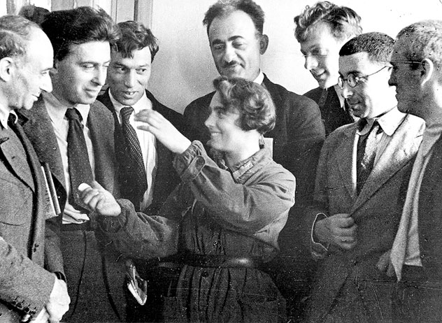 Участники съезда слушают рассказ летчицы. Андре Мальро, И. Эренбург, Б. Пастернак, П. Яшвили, Ю. Герман(?), И. Сельвинский, Н. Тихонов.
