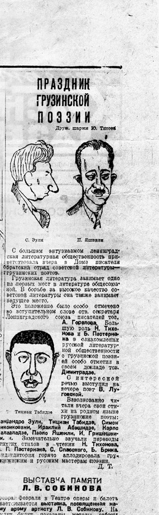 Вырезка из газеты с шаржами на С. Эули, П. Яшвили и Т. Табидзе, начало 1935 г.