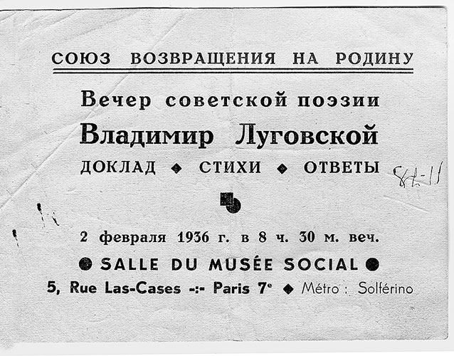 Приглашение на вечер Вл. Луговского в Париже, 1936 г.