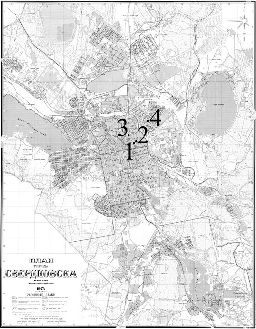 Карта Свердловска с указанием мест инцидентов с малолетними детьми по состоянию на середину июня 1939 г. Обозначено: 1 – похищение 12 июля 1938 г. Герды Грибановой; 2 – попытка похищения 10 февраля 1939 г. Бори Титова; 3 – покушение на убийство 1 мая 1939 г. Раи Рахматуллиной; 4 – похищение 12 июня 1939 г. Али Губиной от барака №1 по ул. Флотская в Пионерском посёлке. Использована карта Свердловска 1947 г. ввиду высокой детализации и точности. Можно видеть, что если точки 1, 2 и 3 расположены довольно компактно на сравнительно небольшой площади, то точка 4 удалена от них более чем на 1,5 км. Преступник вышел за границы Сталинского района и переместился на окраину города. Перед нами явное свидетельство расширение преступником области активного поиска жертв, роста дерзости его посягательств, уверенности в собственных силах и как следствие – опасности для окружающих.