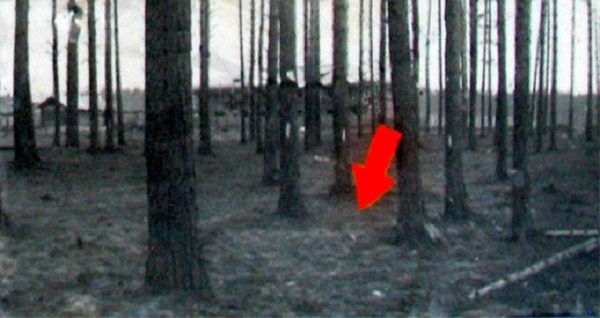 Место обнаружения раненой Али Губиной в зелёном массиве в конце улиц Кондукторов, Смазчиков и Сцепщиков в Пионерском посёлке. Впоследствии этот массив был преобразован в Основинский парк, но в 1939 г. он считался лесом. Красная стрелка нарисована сотрудником УР карандашом от руки, очевидно, с целью придания фотографии большей наглядности и познавательности. Несложно заметить, что лесом это место можно считать довольно условно – никакого кустарника, никакого подлеска, пространство просматривается на большое расстояние. В момент совершения преступления в зелёном массиве находилось большое число отдыхающих людей, милиция впоследствии отыскала около полусотни таковых. Правда, свидетелями их называть не приходилось – никто из любителей отдыха на пленере ничего подозрительного не заметил или не захотел признаться милиции в своей осведомлённости. Сотрудники УР явно подозревали в местных жителях нежелание сотрудничать и настойчиво вели розыск свидетелей на протяжении всего лета 1939 г. Никого, правда, так и не нашли.