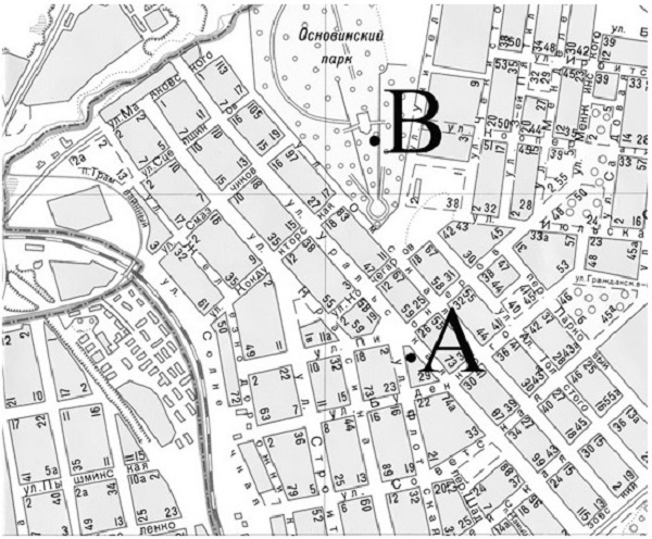 Карта Пионерского посёлка датированная 1947 г., с указанием мест похищения (А) и обнаружения раненой Али Губиной (В). Положение второй точки условно, поскольку её точной привязкой на местности никто в правоохранительных органах не озаботился. Известно, что школа №5, расположенная на улице Кочегаров, являлась ближайшим к месту обнаружения раненой девочки учреждением, в котором находился телефон.