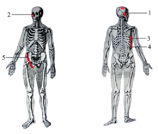 В ходе тщательного предоперационного осмотра были описаны следующие телесные повреждения (см. анатомическую схему):
