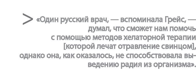 «Один русский врач, – вспоминала Грейс, – думал, что сможет нам помочь с помощью методов хелатной терапии [которой лечат отравление свинцом], однако она, как оказалась, не способствовала выведению радия из организма. Думаю, никто с этим не может помочь». Возможно, осознавая безысходность ситуации, Грейс вызвала Берри и официально составила завещание, хотя она мало что могла оставить своей семье.