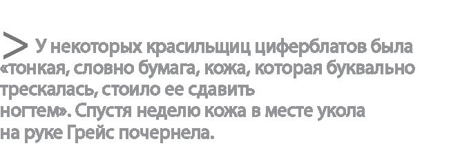 Грейс вздрогнула, когда в нее ткнули иглой, чтобы взять кровь на анализ. Она очень боялась всего, что может привести к образованию порезов или синяков, так как ее кожа больше не заживала. У некоторых красильщиц циферблатов была «тонкая, словно бумага, кожа, которая буквально трескалась, стоило ее сдавить ногтем». Неделю спустя Грейс поняла, что ее переживания были не напрасными: в месте, где врачи укололи ее, кожа почернела.