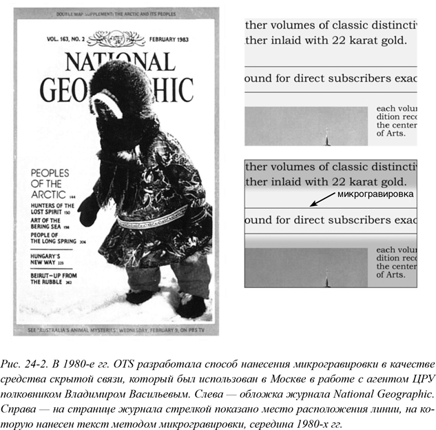 В 1983 г. ЦРУ завербовало в Будапеште советского полковника Васильева, присвоив ему кодовое имя GTACCORD. После его возвращения в Москву OTS разработала новый метод отправки сообщений агенту с использованием лазерной гравировальной системы фирмы Hewlett Packard. Эта методика позволила ЦРУ создавать микроскопические сообщения на черных рамках между полосами текста внутри февральского номера журнала National Geographic за 1983 г.{669} Столь малое сообщение было невидимым для невооруженного глаза, но читалось с помощью 30-кратного увеличения.