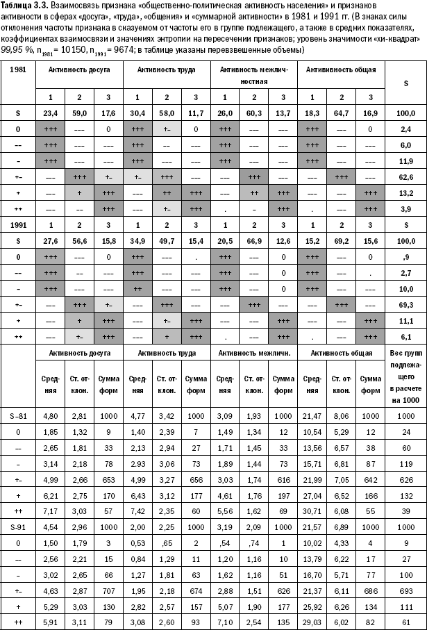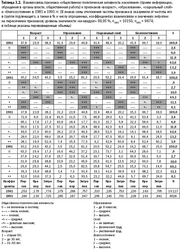 В табл. 1.7 и 1.14 мы привели картины связи политико-идеологического контура и ряда признаков по Таганрогу в 1969 г. и по СССР в 1981 г. При анализе лонгитюдного и повторных исследований мы увидели взаимосвязи общественных подсистем: общественно-политической, включая информационную, и трудовой, межличностной коммуникации и трудовой, замещения поколений и досуга и т. п. Теперь мы можем разобрать взаимосвязи, с одной стороны, демографических признаков (поколение, образование, род занятий) со степенью активности в политико-идеологической подсистеме того времени, а с другой – характер взаимосвязи активности в этой подсистеме с активностью в других подсистемах (достаток, общение, труд, досуг, активность в целом). При этом табл. 3.2 и 3.3 фиксируют характер этих связей сразу: и в начале и в конце анализируемого периода с 1981 по 1991 гг. Пока мы лишь мельком обращаемся к промежуточным движущим силам и мотивам изменений, к фактам обыденного сознания, субъективным отражениям реальности, которые в полной мере будут представлены в главе 4 на фоне структурных изменений. Здесь больше анализируется полюс «деятельность» в ее институциональном аспекте и активности в рамках заданных институтов.