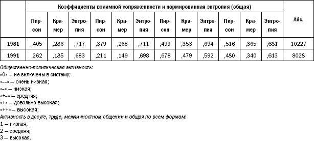 Начнем с картины в целом. За 10 лет наиболее резкому разрушению поверглась структура форм трудовой активности и общественно-политическая структура на уровне трудовых общностей. Активность в сфере труда упала в 2,4, а достаток возрос в 1,4 раза. Упала детность (в 1,3 раза), число форм выражения общественного мнения (обратной связи от населения к власти (в 1,6), форм общественной работы (в 2,4). Сферы межличностной и массовой коммуникации и досуга к 1991 г. в целом фактически остаются на том же уровне активности населения, что в 1981 г. Остается высокой связь активности в политико-идеологическом контуре общества с общей активностью, возрастает эта связь с межличностной коммуникацией (все обсуждают общественные проблемы, прильнув к телевизорам), и энтропия в матрице форм этой связи резко снижается.