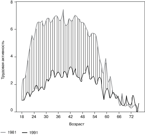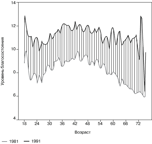 Рис. 3.6.Соотношение уровня достатка населения в 1981 и 1991 гг. на возрастной шкале.
