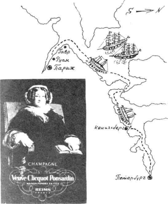 «Мадам Клико Понсарден и ее сотрудник, немец из Рейнской области господин Бон, разработали план захвата русского рынка. Из надлежащего источника господин Бон узнал, что русская императрица ждет ребенка. «Дай бог, чтобы это был мальчик. Тогда в этой громадной стране будет выпито море шампанского. Пожалуйста, никому ни слова, иначе сюда устремятся толпы конкурентов!» Но империя Наполеона породила климат явно не пригодный для торговли. Страны были либо уже втянуты в войну, либо находились на ее грани. Сообщения сделались затруднительными, а иногда почти невозможными. Господин Бон назвал императора злым гением. План захвата России мадам Клико отложился — захватывать Россию отправился Наполеон. Но император пал. И тогда тяжелые повозки, груженные десятками тысяч бутылок, двинулись по направлению к порту Руан. Судно «Гебродерс» было готово к отплытию, на него нагрузили шампанское. Бон решил лично сопровождать драгоценный груз до России. С собой в опасную дорогу взял чай, бисквит, ветчину, уксус, лярд, яблоки. Ни пушек, ни пороху. Судно отчалило. По пути «Гебродерс» неоднократно останавливали фрегаты английские, норвежские, голландские. «Гебродерс» оказывался свидетелем морских разбоев и насилий. Но ловкость и торговая изощренность господина Бона выручали его груз. Мадам Клико вновь отряжает тяжелые повозки с шампанским в порт, и вторая партия бутылок погружается на судно «Благия намерения».