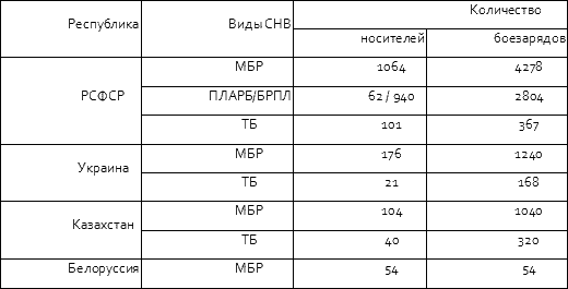 Данные о распределении состава ядерных боеприпасов на территории бывшего Советского Союза не являются абсолютно надежными. Это еще одно свидетельство того, в сколь опасной ситуации страна находилась в конце 1991 г. Информированные исследователи, занимающиеся историей ядерного наследия СССР, приводят следующие не полностью, правда, совпадающие данные (см. табл. 8.6, 8.7).