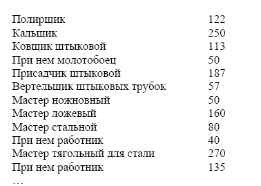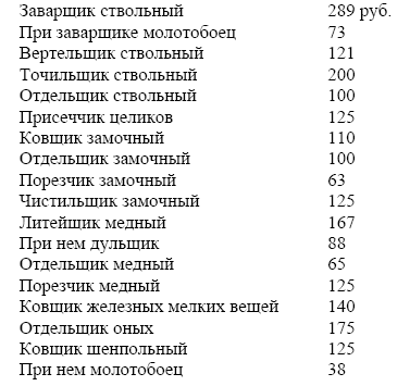 I. Ствольный цех, состоит из 20 артелей; в каждой артели положено 6 заварщиков или мастеров, кои стволы оружейные заваривают; у каждого заварщика 2 молотобойца; 1 точильщик, который снимает со стволов некоторую часть поверхности посредством точила; 3 вертельщика, кои сверлят оные; 1 присеччик, который припаивает целики и петли к стволам; 4 чистильщика, кои поверхность стволов начисто отделывают; 3 штыковых присадчика, кои присажывают к стволам штыки; каждой артели положено сделать 60 столов в неделю.