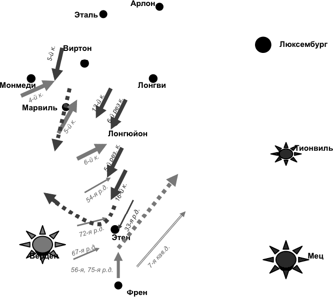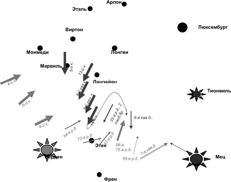 Штаб 5-й германской армии сообщил главному командованию, что противник наступает к северо-востоку, чтобы освободить Лонгви, одновременно он собирается проникнуть в промежуток между 4-й и 5-й армиями и сверх того прорвать фронт 5-й армии. Этому плану противника «противостоять оборонительными действиями невозможно», поэтому 5-я армия должна немедленно перейти в наступление.