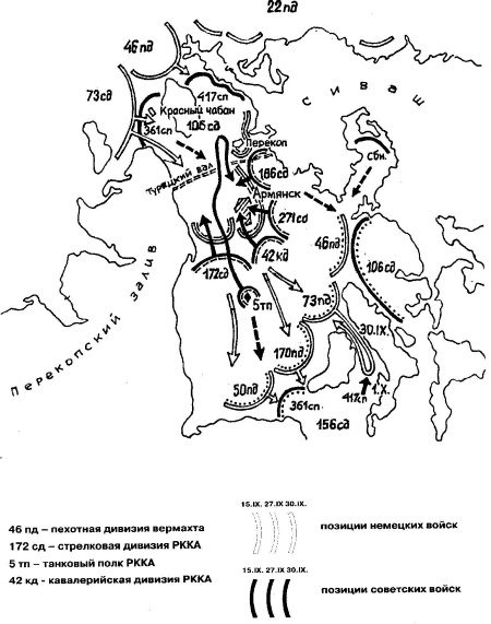 Вот, например, советская армейская версия. «С утра 28 сентября войска оперативной группы снова атаковали противника в районе Щемиловки и севернее Армянска. 5-й танковый полк своими боевыми порядками перевалил за Перекопский вал, перехватил дорогу Чаплинка – Армянск, имея задачей преследовать противника в направлении совхоза “Червоний чабан”. Он вел там бой с тридцатью танками противника[122], препятствуя переходу вражеских резервов через Перекопский вал. Наши стрелковые части и подразделения захватили часть Перекопского вала к западу от старой крепости, но вынуждены были покинуть его. В ходе боев были зафиксированы свежие части немцев: пленные оказались из 65-го и 47-го полков 22-й пехотной дивизии, а также из 170-й дивизии 30-го армейского корпуса. В контратаках участвовали подошедшие средние танки противника (?!). Войска оперативной группы (кавалеристы, части Торопцева) отходили опять к Армянску. Несколько часов шел бой в районе кирпичного завода и кладбища. Эти пункты переходили из рук в руки. В кавалерийской дивизии остались исправными всего два орудия»[123].