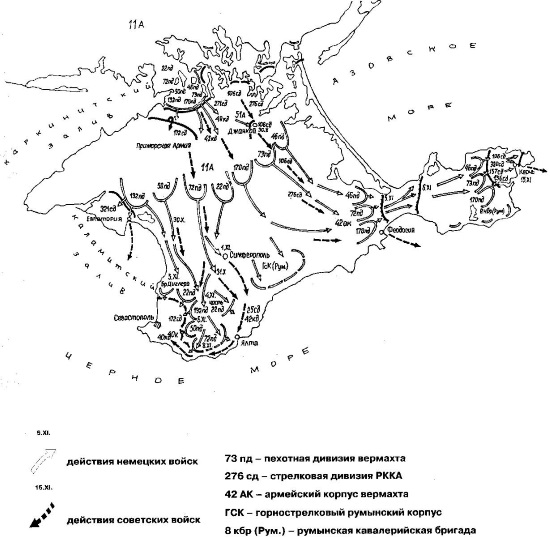 Манштейн же утверждает, что танков у него не было. И действительно, к тому времени «Лейбштандарт Адольф Гитлер» был переброшен на Ростов, а для действий в Крыму Манштейн мог привлечь лишь два корпуса: 30-й в составе 22-й, 72-й и 170-й пехотных дивизий и 54-й в составе 46-й, 73-й и 50-й пехотных дивизий (треть 50-й пехотной дивизии еще была под Одессой).