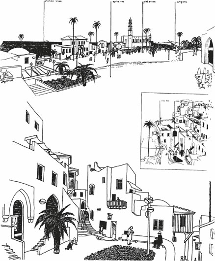 Ил. 69. Саадия Мендель, Элиезер Франкель, Ора и Яков Яары и Гиллель Омер: проект обновления Старой Яффы, перспективный вид, начало 1960-х. Выполнен по заказу Корпорации по развитию Старой Яффы, муниципалитета Тель-Авива и по поручению премьер-министра. Из частного собрания Цви Эльхаяни, архив «Архитектура в Израиле».