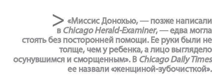 Пока она изучала обстановку в ожидании начала слушаний в девять утра, ее заприметила пресса. «Миссис Донохью, – позже написали в Chicago Herald-Examiner, – едва могла стоять без посторонней помощи. Ее руки были не толще, чем у ребенка, а лицо выглядело осунувшимся и сморщенным. Ее темные глаза возбужденно горели за очками без оправы». В Chicago Daily Times ее не совсем дружелюбно назвали «женщиной-зубочисткой».