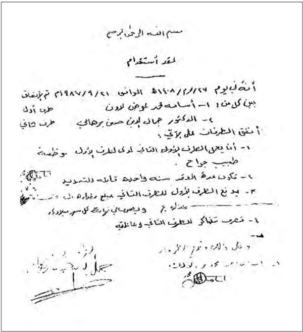 Этот документ, найденный в бумагах Бен Ладена в Абботтабаде, восходит к сентябрю 1987 года. И он представляет собой трудовой договор, благодаря которому предводитель Аль-Каиды на длительное время заручился услугами египетского хирурга по имени Джамаль Эддин Хуссейн Борхани.