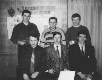 Костяк 1 отдела УБТ ФСК (ФСБ) после очередного награждения. В кабинете автора (в центре) слева от него подполковник АА. Родин, справа майор А. И. Гусак. Стоят слева направо майор Е. В. Макеев, старший лейтенант Д. Е. Хлебников и майор А. В. Литвиненко