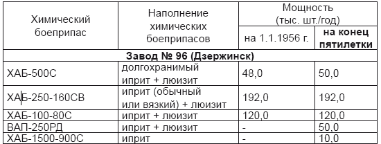 На ЧХЗ (Дзержинск) активно занимались развитием мобилизационных мощностей по наполнению НОВ химических боеприпасов (бомб типа ХАБ-250-110Н и ХАБ-500-200Н, реактивных снарядов МХ-13 и др.) [433, 455].