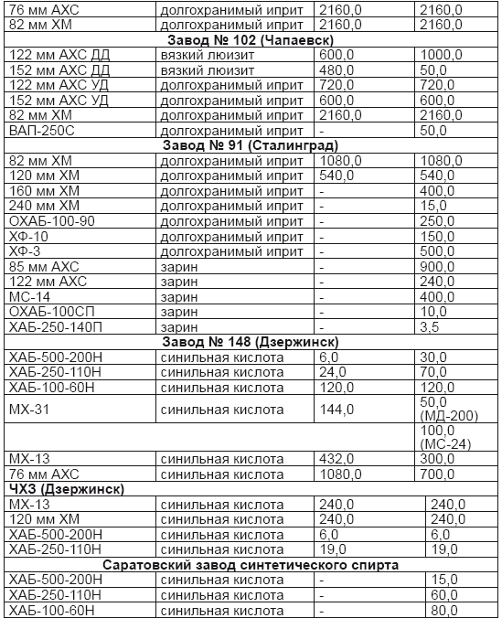 На химическом заводе № 102 (Чапаевск) шли работы по реконструкции цеха по выпуску иприта (XX) [433, 787]. Выполнялись также работы по развитию мощностей по снаряжению артхимснарядов, реактивных снарядов и химмин [433, 434].