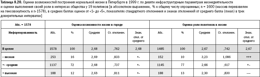 Вот так-то лучше. Оценки, взвешенные относительно целостного поля мнений, разлетаются по некоторым параметрам от почти «+0,6» до «-0,6», да и по различным группам в оценке возможностей «духовного развития» достигают разрыва в «0,4», т. е. 10 %-ного «расстояния» на шкале. В остальном население города едино (см. соответствующие линии графика рис. 8.23), несмотря на разницу в социальной осведомленности: очень плохо с работой, достатком и осуществлением гражданских прав и свобод. И для всех. Кроме, разумеется, некоторых, которые в выборки попасть не могут по вполне понятным причинам, но они в исследованиях и не нужны, так же как и им не нужны исследования.