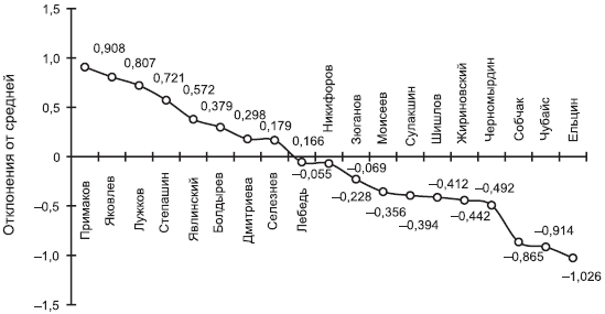 Рис. 8.24. График отклонений от средней общей оценок соответствия своих действий интересам общества у политиков жителями Санкт-Петербурга в сентябре 1999 г. (n = 1600 человек)