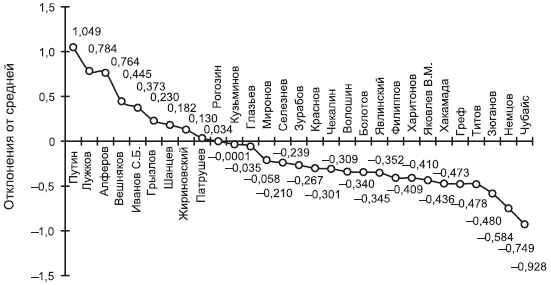 Рис. 8.25. График отклонений от средней общей оценок соответствия своих действий интересам общества у политиков жителями Москвы весной 2004 г. (n = 131 опрошенный)