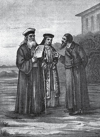Крымские караимы и еврей-раввинист (талмудист). Вариация на тему литографии Карла Гуна. Из живописного альбома «Народы России». СПб., 1879 г.