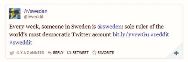 Быстрее других социальных сетей в Швеции растет в последние годы Twitter. Он и был использован для политической мобилизации граждан. В январе 2012 года Совет по Туризму Швеции принимает решение, что управление аккаунтом Совета — @sweden («швед») — будет передаваться каждую неделю одному из граждан страны. Проект был назван «самый демократичный Твиттер-аккаунт».
