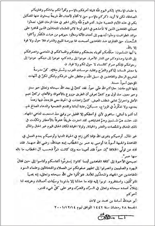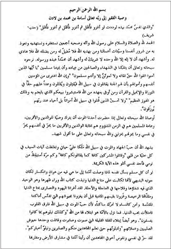 Этот четырехстраничный документ, озаглавленный «Завещание бедняка, Усамы бен Мохаммеда бен Ладена, перед своим Богом», датируется 18 декабря 2001 года. Данный текст наверняка был написан в самый разгар битвы в ущелье Тора-Бора, когда Бен Ладену казалась неминуемой скорая гибель. Главарь Аль-Каиды ссылается при этом на мусульманский обычай, рекомендующий каждому правоверному «составить завещание в тот день, когда он почувствует приближение смерти».