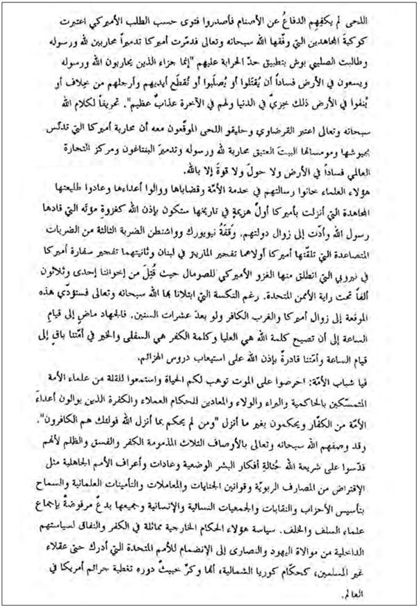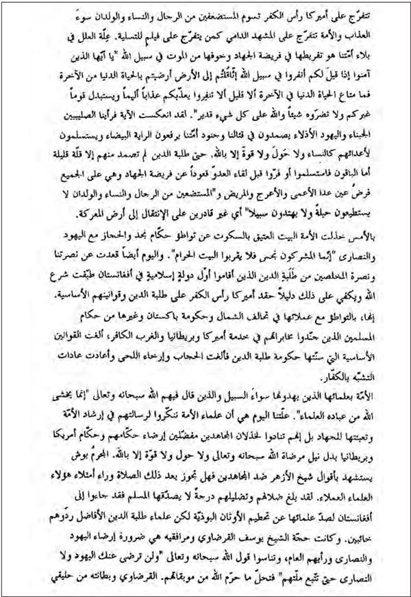 Вчера Умма не удержала нашу «древнюю обитель» [то есть мавзолей Кааба, почитаемый мусульманами как «обитель Аллаха»], когда правители Хиджаза и Неджда [то есть Саудовской Аравии] продались иудеям и назарянам [то есть христианам]. «Неверные нечисты и потому не могут приближаться к священной обители». А сегодня случилась вторая беда: Умма отвернулась от своего долга прийти на помощь нам и талибам, построившим в Афганистане первое исламское государство, в котором применяется шариат Аллаха. И потому Америка, это боевое копье всех неверных, смогла беспрепятственно обрушить свой гнев на талибов и на фундаментальные законы, установленные ими. При соучастии своих пособников из Северного Альянса, правительства Пакистана и других мусульманских правителей, мобилизовавших свои мухабараты [то есть органы тайной полиции] на службу Америке, Великобритании и неверному Западу, этим силам удалось отменить фундаментальные законы, установленные талибами, упразднить хиджабы и обязательное ношение бороды в угоду обычаям, по-обезьяньи копирующим нравы неверных.