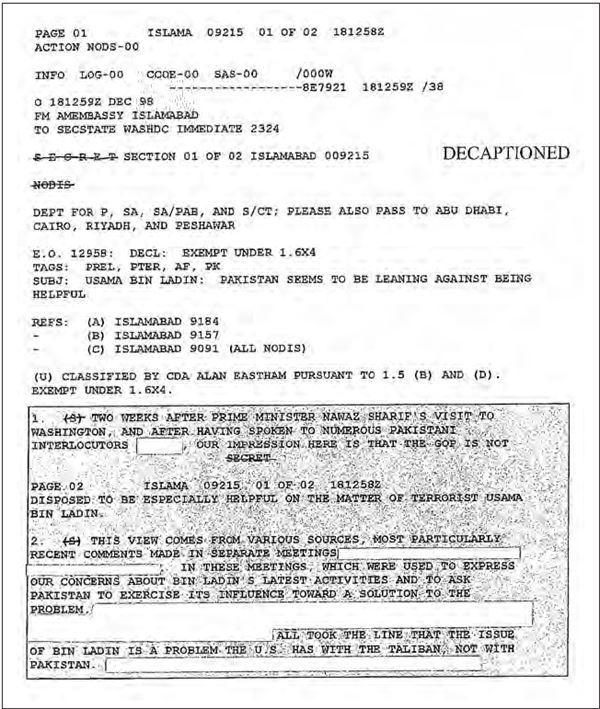 Эта телеграмма, отправленная американским посольством в Исламабаде 18 декабря 1998 года, обвиняла пакистанские власти в недостаточном сотрудничестве в борьбе против Аль-Каиды. Данный документ появился через две недели после визита в Вашингтон пакистанского премьерминистра Наваза Шарифа, в ходе которого он пообещал поддержать усилия США и арабского мира, направленные на то, чтобы убедить талибов экстрадировать Бен Ладена.